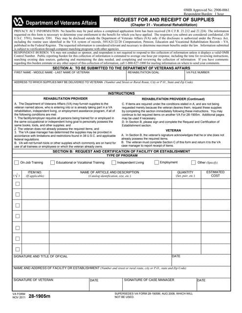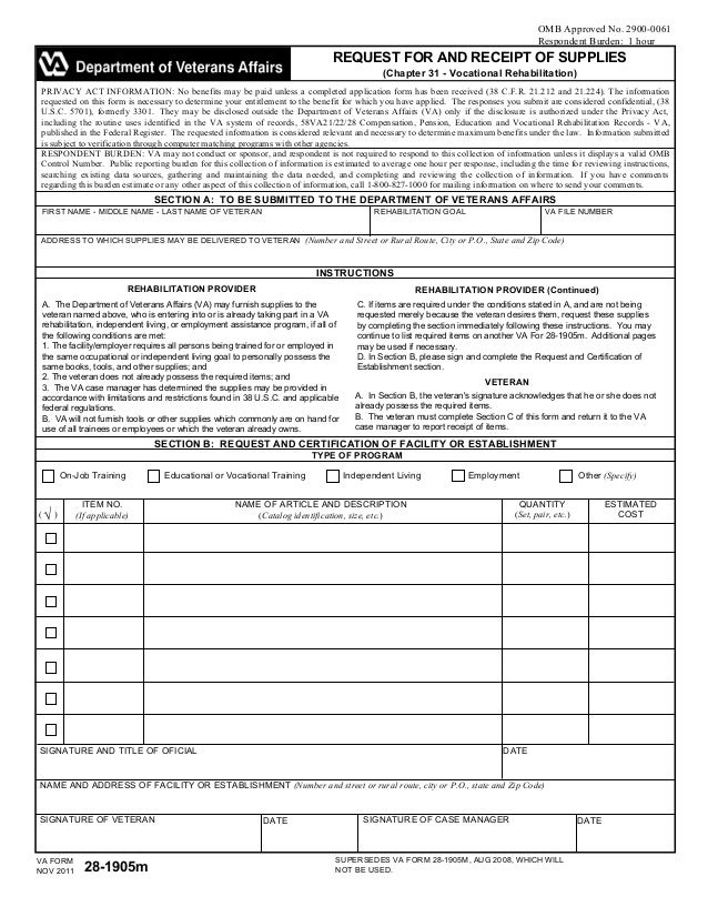 1 hour REQUEST FOR SUPPLIES Chapter 31-Vocational Rehabilitation ITEM NO. Go through the recommendations to determine which data you must provide. You may continue to list required items on another VA For 28-1905m.